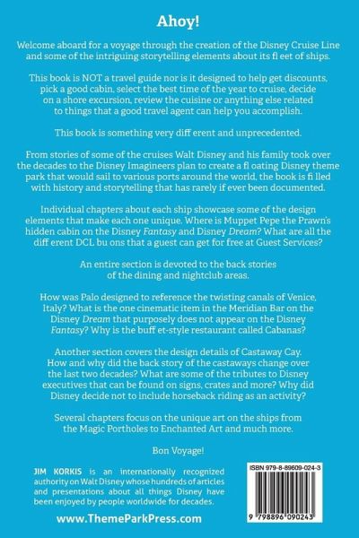 Ahoy! Welcome aboard for a voyage through the creation of the Disney Cruise Line and some of the intriguing storytelling elements about its fleet of ships. This book is NOT a travel guide nor is it designed to help get discounts, pick a good cabin, select the best time of the year to cruise, decide on a shore excursion, review the cuisine or anything else related to things that a good travel agent can help you accomplish. This book is something very different and unprecedented. From stories of some of the cruises Walt Disney and his family took over the decades to the Disney Imagineers plan to create a floating Disney theme park that would sail to various ports around the world, the book is filled with history and storytelling that has rarely if ever been documented. Individual chapters about each ship showcase some of the design elements that make each one unique. Where is Muppet Pepe the Prawn's hidden cabin on the Disney Fantasy and Disney Dream? What are all the different DCL buttons that a guest can get for free at Guest Services? An entire section is devoted to the back stories of the dining and nightclub areas. How was Palo designed to reference the twisting canals of Venice, Italy? What is the one cinematic item in the Meridian Bar on the Disney Dream that purposely does not appear on the Disney Fantasy? Why is the buffet-style restaurant called Cabanas? Another section covers the design details of Castaway Cay. How and why did the back story of the castaways change over the last two decades? What are some of the tributes to Disney executives that can be found on signs, crates and more? Why did Disney decide not to include horseback riding as an activity? Several chapters focus on the unique art on the ships from the Magic Portholes to Enchanted Art and much more. Bon Voyage!