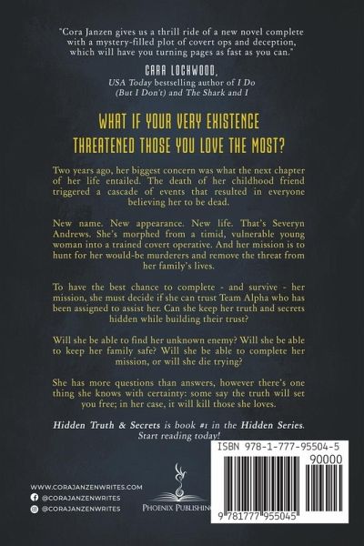 What if your very existence threatened those you love the most? Two years ago, her biggest concern was what the next chapter of her life entailed. The death of her childhood friend triggered a cascade of events that resulted in everyone believing her to be dead. New name. New appearance. New life. That's Severyn Andrews. She's morphed from a timid, vulnerable young woman into a trained covert operative. And her mission is to hunt for her would-be murderers and remove the threat from her family's lives. To have the best chance to complete - and survive - her mission, she must decide if she can trust Team Alpha who has been assigned to assist her. Can she keep her truth and secrets hidden while building their trust? Will she be able to find her unknown enemy? Will she be able to keep her family safe? Will she be able to complete her mission, or will she die trying? She has more questions than answers, however, there's one thing she knows with certainty: some say the truth will set you free; in her case, it will kill those she loves. Hidden Truth & Secrets is book #1 in the Hidden Series and is not a stand-alone novel. Start reading today! "Cora Janzen gives us a thrill ride of a new novel complete with a mystery-filled plot of covert ops and deception, which will have you turning pages as fast as you can." Cara Lockwood, USA Today bestselling author
