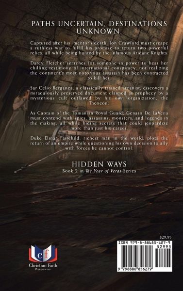PATHS UNCERTAIN, DESTINATIONS UNKNOWN.Captured after his mentor's death, Jon Crawford must escape a ruthless war to fulfill his promise to return two powerful relics, all while being hunted by the infamous Aridane Knights. Darcy Fletcher searches for someone in power to hear her chilling testimony of international conspiracy, not realizing the continent's most notorious assassin has been contracted to kill her. Sar Celio Berganza, a classically trained arcanist, discovers a miraculously preserved document claimed as prophecy by a mysterious cult outlawed by his own organization, the Theocon. As Captain of the Tomanian Royal Guard, Genaro De LaVena must contend with spies, assassins, monsters, and legends in the making, all while hiding secrets that could jeopardize more than just his career. Duke Elinar Fairchild, richest man in the world, plots the return of an empire while questioning his own decision to ally with forces he cannot control. HIDDEN WAYSBook 2 in The Year of Veras Series