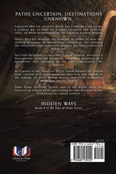 PATHS UNCERTAIN, DESTINATIONS UNKNOWN.Captured after his mentor's death, Jon Crawford must escape a ruthless war to fulfill his promise to return two powerful relics, all while being hunted by the infamous Aridane Knights. Darcy Fletcher searches for someone in power to hear her chilling testimony of international conspiracy, not realizing the continent's most notorious assassin has been contracted to kill her. Sar Celio Berganza, a classically trained arcanist, discovers a miraculously preserved document claimed as prophecy by a mysterious cult outlawed by his own organization, the Theocon. As Captain of the Tomanian Royal Guard, Genaro De LaVena must contend with spies, assassins, monsters, and legends in the making, all while hiding secrets that could jeopardize more than just his career. Duke Elinar Fairchild, richest man in the world, plots the return of an empire while questioning his own decision to ally with forces he cannot control. HIDDEN WAYSBook 2 in The Year of Veras Series