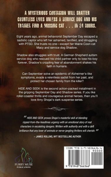 "...a creepy must-read mystery for animal lovers." -J.T. Ellison, NYT bestselling author A ruthless stalker. A lethal epidemic. Can a wounded woman prevent the past from destroying her future and killing those she loves? September Day constantly struggles with PTSD. Ashamed of a secret scandal from her past, she keeps her one-time cop enemy at arm's length when he'd like to be more than friends. Instead, she relies on her support cat Macy and service dog Shadow to heal her heart. When her mother encourages September to resume normal life, she leaves the house only to discover her stalker has tracked her down! But Macy may have a devastating contagion affecting both people and pets, so September and Shadow race the clock to rescue him. With innocent lives on the line, can September and Shadow stop the plague, evade her stalker, and protect her new friends from the killer? HIDE AND SEEK is the second action-packed installment in the gripping September and Shadow series. If you like roller-coaster thrills, courageous animal heroes, and a slow-burn enemies-to-friends-to-lovers saga, then you'll love Amy Shojai's dark suspense series. Buy HIDE AND SEEK to pursue justice today!