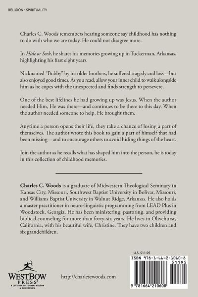 Charles C. Woods remembers hearing someone say childhood has nothing to do with who we are today. He could not disagree more. In Hide or Seek, he shares his memories growing up in Tuckerman, Arkansas, highlighting his first eight years. Nicknamed "Bubby" by his older brothers, he suffered tragedy and loss-but also enjoyed good times. As you read, allow your inner child to walk alongside him as he copes with the unexpected and finds strength to persevere. One of the best lifelines he had growing up was Jesus. When the author needed Him, He was there-and continues to be there to this day. When the author needed someone to help, He brought them. Anytime a person opens their life, they take a chance of losing a part of themselves. The author wrote this book to gain a part of himself that had been missing-and to encourage others to avoid hiding things of the heart. Join the author as he recalls what has shaped him into the person, he is today in this collection of childhood memories.