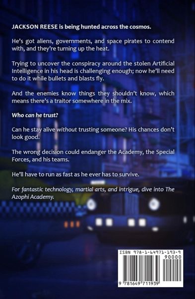 Jackson Reese is being hunted across the cosmos. He's got aliens, governments, and space pirates to contend with, and they're turning up the heat. Trying to uncover the conspiracy around the stolen Artificial Intelligence in his head is challenging enough; now he'll need to do it while bullets and blasts fly. And the enemies know things they shouldn't know, which means there's a traitor somewhere in the mix. Who can he trust? Can he stay alive without trusting someone? His chances don't look good. The wrong decision could endanger the Academy, the Special Forces, and his teams. He'll have to run as fast as he ever has to survive. For fantastic technology, martial arts, and intrigue, dive into The Azophi Academy. Go up and hit "Read for Free" or "Buy Now" to join the adventure today.