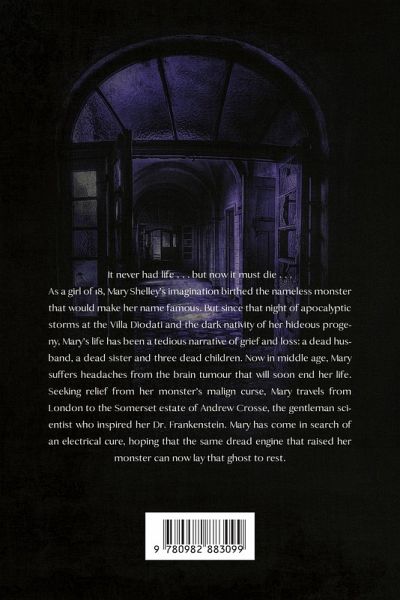 It never had life . . . but now it must die . . . As a girl of 18, Mary Shelley's imagination birthed the nameless monster that would make her name famous. But since that night of apocalyptic storms at the Villa Diodati and the dark nativity of her hideous progeny, Mary's life has been a tedious narrative of grief and loss: a dead husband, a dead sister and three dead children. Now in middle age, Mary suffers headaches from the brain tumour that will soon end her life. Seeking relief from her monster's malign curse, Mary travels from London to the Somerset estate of Andrew Crosse, the gentleman scientist who inspired her Dr. Frankenstein. Mary has come in search of an electrical cure, hoping that the same dread engine that raised her monster can now lay that ghost to rest.
