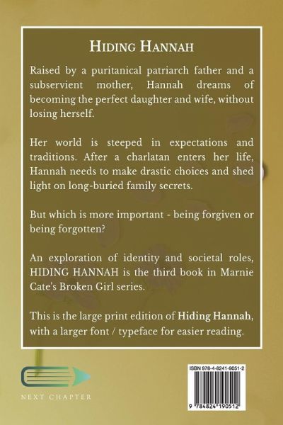 Raised by a puritanical patriarch father and a subservient mother, Hannah dreams of becoming the perfect daughter and wife, without losing herself. Her world is steeped in expectations and traditions. After a charlatan enters her life, Hannah needs to make drastic choices and shed light on long-buried family secrets. But which is more important - being forgiven or being forgotten? An exploration of identity and societal roles, HIDING HANNAH is the third book in Marnie Cate's Broken Girl series. This is the large print edition of Hiding Hannah, with a larger font / typeface for easier reading.