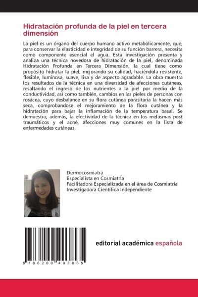 La piel es un órgano del cuerpo humano activo metabólicamente, que, para conservar la elasticidad e integridad de su función barrera, necesita como componente esencial el agua. Esta investigación presenta y analiza una técnica novedosa de hidratación de la piel, denominada Hidratación Profunda en Tercera Dimensión, la cual tiene como propósito hidratar la piel, mejorando su calidad, haciéndola resistente, flexible, luminosa, suave, lisa y de aspecto agradable. La obra muestra los resultados de la técnica en una diversidad de afecciones cutáneas, resaltando el ingreso de los nutrientes a la piel por medio de la conductividad, así como también, cambios en las pieles de personas con rosácea, cuyo desbalance en su flora cutánea parasitaria la hacen más seca, comprobandose el mejoramiento de la flora cutánea y la hidratación para bajar la inflamación de la temperatura basal. Se demuestra, además, la efectividad de la técnica en los melasmas post traumáticos y el acné, afecciones muy comunes en la lista de enfermedades cutáneas.