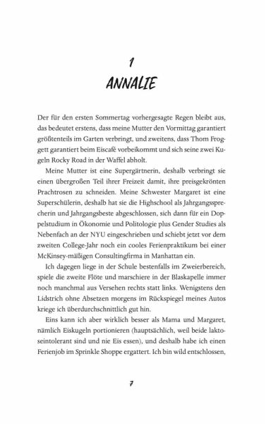 Bisher hat Annalie in den Ferien in der örtlichen Eisdiele gejobbt und sich nichts sehnlicher gewünscht, als dass der süßeste Junge der Schule sie endlich wahrnimmt. Ihre ältere Schwester Margaret hingegen will die verschlafene Kleinstadt endlich hinter sich lassen und hat ihr Praktikum in New York auch deshalb angetreten, um ihrem Ex-Freund nicht mehr zu begegnen.