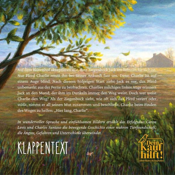 Auf dem Blütenhof akzeptieren alle, dass Ziegenbock Jack am liebsten für sich ist. Nur Pferd Charlie rennt ihn bei seiner Ankunft fast um. Denn Charlie ist auf einem Auge blind. Nach diesem holprigen Start zieht Jack es vor, das Pferd unbemerkt aus der Ferne zu beobachten. Charlies milchiges, linkes Auge erinnert Jack an den Mond, der ihm im Dunkeln immer den Weg weist. Doch wer weist Charlie den Weg? Als der Ziegenbock sieht, wie oft sich das Pferd verirrt oder stößt, nimmt er all seinen Mut zusammen und beschließt, Charlie beim Finden des Weges zu helfen: »Hier lang, Charlie«.