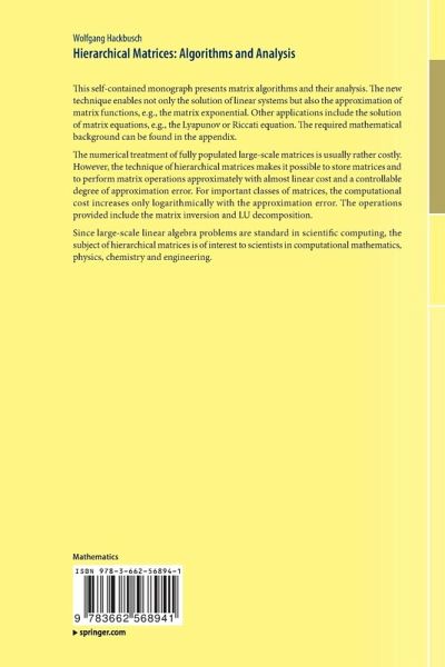 "The book 'Hierarchical matrices: algorithms and analysis' is a self-contained monograph which presents an efficient possibility to handle the numerical treatment of fully populatedlarge scale matrices appearing in scientific computations, and therefore it is of interest to scientists in computational mathematics, physics, chemistry and engineering." (Constantin Popa, zbMATH 1336.65041, 2016)