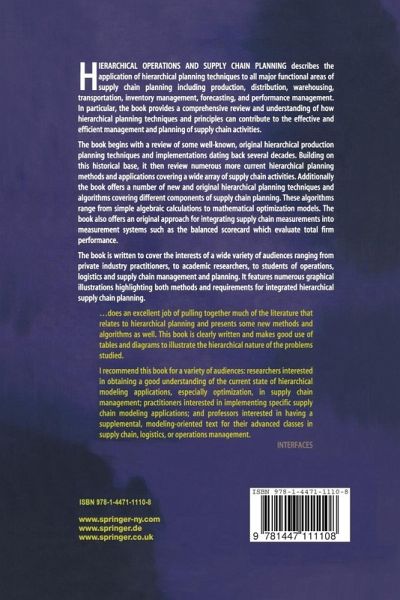 The book reviews well-known, original hierarchical production planning techniques and implementations dating back several decades and numerous more current hierarchical planning methods and applications covering an array of supply chain activities. A number of novel hierarchical planning techniques and algorithms covering different components of supply chain planning are offered as is an original approach for integrating supply chain measurements into systems such as the balanced scorecard which evaluate total firm performance.