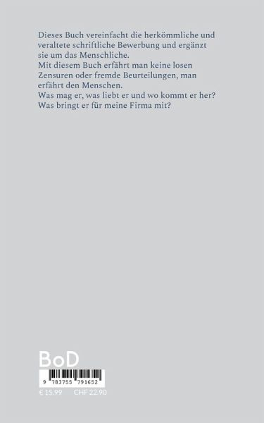 Dieses Buch vereinfacht die herkömmliche und veraltete schriftliche Bewerbung und ergänzt sie um das Menschliche. Mit diesem Buch erfährt man keine losen Zensuren oder fremde Beurteilungen, man erfährt den Menschen. Was mag er, was liebt er und wo kommt er her?Was bringt er für meine Firma mit?