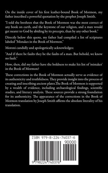 On the inside cover of his first leather-bound Book of Mormon, my father inscribed a powerful quotation by the prophet Joseph Smith. "I told the brethren that the Book of Mormon was the most correct of any book on earth, and the keystone of our religion, and a man would get nearer to God by abiding by its precepts, than by any other book." Directly below this quote, my father had compiled a list of scriptures labeled "Mistakes in the Book of Mormon." Moroni candidly and apologetically acknowledges: "And if there be faults they be the faults of a man. But behold, we know no fault." How, then, did my father have the boldness to make his list of 'mistakes' in the Book of Mormon? These corrections in the Book of Mormon actually serve as evidence of its authenticity and truthfulness. They provide insight into the process of creating and inscribing ancient plates.The Book of Mormon is supported by a wealth of evidence, including archaeological findings, scientific studies, and literary analysis. These sources provide a strong foundation for its authenticity. The appearance of the corrections in the Book of Mormon translation by Joseph Smith affirms the absolute literality of his translation.