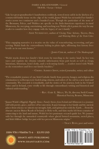 Jannet L. Walsh, Murdock, Minnesota-based photographer, author, educator, is a first-time published author of a creative nonfiction quest about her Minnesota and Irish heritage. Walsh received a 2022-2024 McKnight Foundation Grant for writing about her family's Irish Canadian roots on Wolfe Island, Ontario, Canada, in the middle of the St. Lawrence River. In this endeavor, Walsh combines Irish family detective skills with creative nonfiction narration. Readers imagine they are walking with her in rural Minnesota, in Ireland, and in Canada, in her "you are there" writing genre, inherited from her family's oral tradition. Walsh has written on technology, travel, religion, and was a newspaper columnist on career, workforce, and business. Her writing appears in IrishCentral.com as a correspondent on topics related to the Irish Diaspora. Her photos and videos have been featured by CNN, CNN iReport, HLN, The New York Times Company and the California Academy of Sciences. Walsh served as assistant professor of strategic communications and multimedia at St. Cloud State University. She holds a Master of Arts from Ohio University in photography, and Master of Fine Arts in Creative Writing from Augsburg University. Higgledy Piggledy Stones: Family Stories from Ireland and Minnesota is her first book.