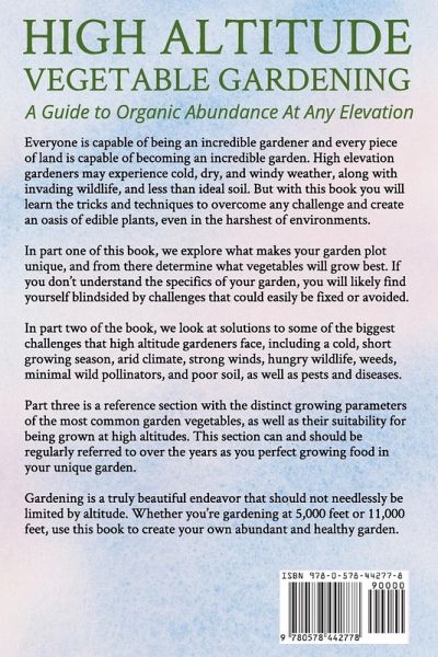 Everyone is capable of being an incredible gardener and every piece of land is capable of becoming an incredible garden. High elevation gardeners may experience cold, dry, and windy weather, along with invading wildlife, and less than ideal soil. But with this book you will learn the tricks and techniques to overcome any challenge and create an oasis of edible plants, even in the harshest of environments. In part one of this book, we explore what makes your garden plot unique, and from there determine what vegetables will grow best. If you don't understand the specifics of your garden, you will likely find yourself blindsided by challenges that could easily be fixed or avoided. In part two of the book, we look at solutions to some of the biggest challenges that high altitude gardeners face, including a cold, short growing season, arid climate, strong winds, hungry wildlife, weeds, minimal wild pollinators, and poor soil, as well as pests and diseases. Part three is a reference section with the distinct growing parameters of the most common garden vegetables, as well as their suitability for being grown at high altitudes. This section can and should be regularly referred to over the years as you perfect growing food in your unique garden. Gardening is a truly beautiful endeavor that should not needlessly be limited by altitude. Whether you're gardening at 5,000 feet or 11,000 feet, use this book to create your own abundant and healthy garden.