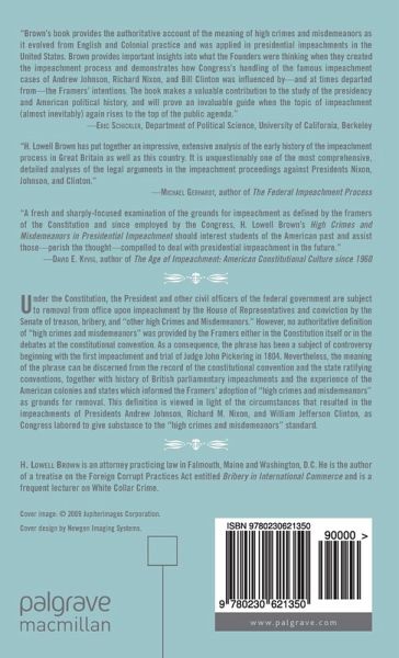 US Constitution states that the President is subject to removal from office upon impeachment and conviction of treason, bribery and 'other high Crimes and Misdemeanors.' In this book, Brown examines history behind this clause as well as the impeachments of Presidents Johnson, Nixon and Clinton.