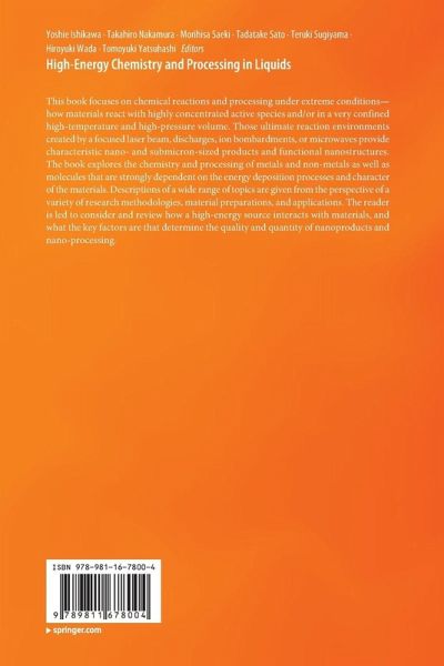 Part I: High-energy chemistry and processing of metals.- 1. Laser-induced bubble generation on excitation of gold nanoparticles.- 2. Metal and alloy nanoparticles formed by laser-induced nucleation method.- 3. Laser-induced reduction and particle formation of precious metal ions in a solution: Application to metal recovery.- 4. Synthesis of metal nano-particles induced by plasma-assisted electrolysis.- 5. Controllable surface modification of colloidal nanoparticles using laser ablation in liquids and its utilization.- Part II: High-energy processing of nonmetals.- 6. Fabrication and control of semiconductor random lasers using laser processing techniques.- 7. Formation mechanism of spherical submicrometer particles by pulsed laser melting in liquid.- 8. Mass production of spherical submicrometer particles by flow-style pulsed laser melting in liquid.- 9. Material processing for colloidal silicon quantum dot formation.- 10. Processing of transparent materials using laser-induced high-energy state in liquid.- 11. Functional nanomaterial and nanostructure synthesized by femtosecond laser pulses.- 12. Preparation of functional nanoparticles by laser process in liquid and their optical applications.- Part III: High-energy chemistry of nonmetals.- 13. Nanoscale transient laser heating and the related chemical process of organic solid.- 14. Fundamentals and applications of novel high-energy reaction fields by microwave chemistry.- 15. Study on the preparation and photocatalytic activity of the laser modified photocatalysis.- 16. Control of crystallization by intense focused laser beam.- 17. Electrocatalysts developed from ion-implanted carbon materials.- 18. Carbon nanoparticle production in plasma filaments generated by intense femtosecond laser pulses.