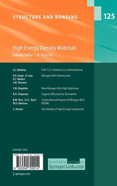 This book summarizes some recent developments in the area of high-energy high-density (HEDM) materials. Rather than being comprehensive in scope, emphasis is given to structural and bonding features of highly energetic - terials with possible applications as high explosives (secondary explosives) or propellants. In this book we do not focus on primary explosives (e.g. lead azidereplacements)sincebyde?nitiontheexplosiveperformance(detonation velocity and detonation pressure) of such materials although very sensitive are much less energetic than secondary (high) explosives. Modern HEDMs derive most of their energy (i) from oxidation of the c- bon backbone, as in traditional energetic materials, (ii) from ring or cage strain, or (iii) from their very high positive heat of formation. Examples of the?rstclassare traditionalexplosives, suchasTNT,RDXand HMX.Modern nitro-compounds, such as CL-20 or the recently reported hepta- and octa- trocubanes, belong to the second group of explosives and possess very high densities and enhance the energies utilizing substantial cage strain. Members of the third class of compounds are high-nitrogen compounds (up to 85% - trogencontent), such as aminotetrazole and nitrotetrazolederivatives, which show the desired remarkable insensitivity to electrostatic discharge, friction and impact, while having very high positive heats of formation and therefore very high explosive powers. The synthesis of energetic, non-nuclear materials for military application has been a long-term goal in various academic and military research groups worldwide. Some of the current challenges that face HEDMscientists are: Demandforenvironmentallycompatibleandtoxicologicallyacceptable- plosives and propellants. Examples are replacements for TNT, RDX and HMXsince nitro-explosivesper se,aswellastheir environmental transf- mation products, are toxic.
