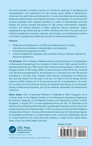 The book gives a cohesive overview of innovations, advances in processing and characterization, and applications for high entropy alloys (HEAs) in performance-critical and non-performance-critical sectors. It covers manufacturing and processing, advanced characterization and analysis techniques and evaluation of mechanical and physical properties.