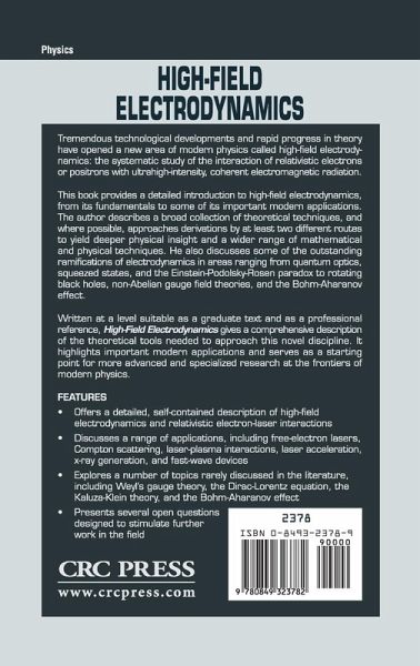 Tremendous technological developments and rapid progress in theory have opened a new area of modern physics called high-field electrodynamics: the systematic study of the interaction of relativistic electrons or positrons with ultrahigh-intensity, coherent electromagnetic radiation. This advanced undergraduate/graduate-level text provides a detailed introduction to high-field electrodynamics, from its fundamentals to some of its important modern applications. The author describes a broad collection of theoretical techniques, and where possible, approaches derivations by at least two different routes to yield deeper physical insight and a wider range of mathematical and physical techniques. He also discusses some of the outstanding ramifications of electrodynamics in areas ranging from quantum optics, squeezed states, and the Einstein-Podolsky-Rosen paradox to rotating black holes, non-Abelian gauge field theories, and the Bohm-Aharanov effect. High-Field Electrodynamics gives a comprehensive description of the theoretical tools needed to approach this novel discipline. It highlights important modern applications and serves as a starting point for more advanced and specialized research at the frontiers of modern physics.