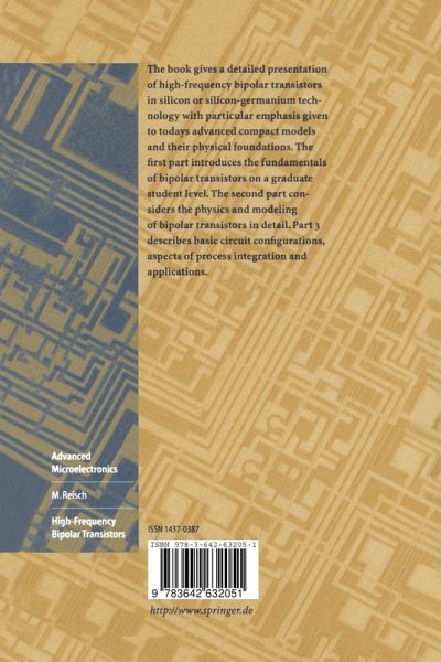 1. An Introductory Survey.- 1.1 History.- 1.2 Devices, Circuits, Compact Models.- 1.3 Semiconductors.- 1.4 PN Junctions.- 1.5 Bipolar Transistor Principles.- 1.6 Elementary Large-Signal Models.- 1.7 Elementary Small-Signal Models.- 1.8 Noise Modeling.- 1.9 Orders of Magnitude.- 1.10 References.- 2. Semiconductor Physics Required for Bipolar-Transistor Modeling.- 2.1 Band Structure.- 2.2 Thermal Equilibrium.- 2.3 The Boltzmann Equation.- 2.4 The Drift-Diffusion Approximation.- 2.5 Hydrodynamic Model.- 2.6 Generation and Recombination.- 2.7 Heavily Doped Semiconductors.- 2.8 Silicon Device Modeling in the Drift-Diffusion Approximation.- 2.9 References.- 3. Physics and Modeling of Bipolar Junction Transistors.- 3.1 The Regional Approach.- 3.2 Transfer Current, Early Effect.- 3.3 Emitter-Base Diode, Current Gain.- 3.4 Base-Collector Diode, Breakdown.- 3.5 Charge Storage, Transit Time.- 3.6 Series Resistances.- 3.7 High-Level Injection.- 3.8 The Gummel-Poon Model.- 3.9 Small-Signal Description.- 3.10 Figures of Merit.- 3.11 Temperature Dependences, Self-Heating.- 3.12 Parameter Extraction - DC Measurements.- 3.13 Parameter Extraction - AC Measurements.- 3.14 The VBIC Model.- 3.15 The HICUM Model.- 3.16 The MEXTRAM Model.- 3.17 References.- 4. Physics and Modeling of Heterojunction Bipolar Transistors.- 4.1 Heterojunctions.- 4.2 Heterojunction Bipolar Transistors.- 4.3 Silicon-Based Semiconductor Hctorostructures.- 4.4 SiGe HBTs.- 4.5 Compound Semiconductor HBTs.- 4.6 References.- 5. Noise Modeling.- 5.1 Noise in Semiconductors.- 5.2 Transport Theory of Noise.- 5.3 Noise of pn Junctions.- 5.4 Noise Generated by the Transfer Current.- 5.5 High-Frequency Noise Equivalent Circuit.- 5.6 Noise Figure.- 5.7 Low-Frequency Noise.- 5.8 References.- 6. Basic CircuitConfigurations.- 6.1 Common-Emitter Configuration.- 6.2 Common-Collector Configuration.- 6.3 Common-Base Configuration.- 6.4 The Diode-Connected Bipolar Transistor.- 6.5 Current Sources and Active Loads.- 6.6 Differential Amplifiers.- 6.7 Analog Multipliers.- 6.8 Two-Transistor Amplifier Stages.- 6.9 Bandgap References.- 6.10 Digital Circuits.- 6.11 References.- 7. Process Integration.- 7.1 Fabrication of Integrated npn Transistors.- 7.2 Passive Components.- 7.3 PNP Transistors.- 7.4 Reliability.- 7.5 References.- 8. Applications.- 8.1 Emitter-Coupled Logic.- 8.2 High-Speed Optical Transmission Systems.- 8.3 RF Microelectronics.- 8.4 BiCMOS.- 8.5 References.- A. Linear and Nonlinear Response.- A.1 Linear Response.- A.1.1 Step Response, Elmore Delay.- A.2 Nonlinear Systems Without Memory.- A.2.1 Harmonic Distortion, Gain Compression.- A.2.2 Intermodulation Distortion.- A.3 Nonlinear Systems with Memory.- A.3.1 Volterra Series.- A.4 References.- B. Linear Two-Ports, s-Parameters.- B.1 Indefinite Admittance Matrix.- B.2 Terminated Two-Ports.- B.2.1 Input and Output Impedance.- B.2.2 Voltage and Current Gain.- B.2.3 Power Gain.- B.2.4 Stability.- B.2.5 Incident and Reflected Power.- B.3 S-Parameters.- B.3.1 Relations between s-Parameters and Two-Port Parameters.- B.3.2 Matching and Power Gain.- B.4 References.- C. PN Junctions: Details.- C.1 Boundary Conditions at PN Junctions.- C.2 Epitaxial Diode.- C.3 Minority-Carrier Transport in Heavily Doped Emitter Regions.- C.4 High-Frequency Diode Admittance.- C.5 References.- D. Bipolar Transistor: Details.- D.1 Drift Transistor.- D.1.1 Electron Transport Through the Base Region.- D.1.3 Excess Phase.- D.1.4 Collector Transit Time.- D.1.5 Small-Signal Analysis.- D.2 Quasi-Thrce-Dimensional Computations of the Base Resistance.- D.3Generation of Model Parameters from Layout Data.- D.4 Generalization of the Gummol Transfer Current Relation to Arbitrary Geometries.- D.5 Definition of Series Resistances Within the Integral Charge Control Relation.- D.6 Multiplication Factor.- D.7 References.- E. Noise: Details.- E.1 Some Statistics.- E.1.1 Stochastic Variables, Correlation.- E.1.2 Ensemble Average, Distribution Function.- E.1.3 Spectral Density.- E.1.4 Carson Theorem, Shot Noise.- E.2 Velocity Fluctuations and Diffusion.- E.3 Thermodynamics and Noise.- E.4 Generation-Recombination Noise.- E.5 McWorther Model of 1/f Noise.- E.6 Short-Base Diode with Metal Contact.- E.7 Short-Base Diode with Polysilicon Contact.- E.8 Equivalent-Circuit Representation of Transfer Current Noise.- E.9 References.- F. Overtemperature Developed During Electrostatic Discharges.- F.1 Thermal Conductivity.- F.2 Transient Overtemperature During a Short Pulse.- F.3 References.