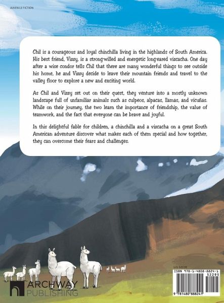 Chil is a courageous and loyal chinchilla living in the highlands of South America. His best friend, Vizzy, is a strong-willed and energetic long-eared vizcacha. One day after a wise condor tells Chil that there are many wonderful things to see outside his home, he and Vizzy decide to leave their mountain friends and travel to the valley floor to explore a new and exciting world. As Chil and Vizzy set out on their quest, they venture into a mostly unknown landscape full of unfamiliar animals such as culpeos, alpacas, llamas, and vicuñas. While on their journey, the two learn the importance of friendship, the value of teamwork, and the fact that everyone can be brave and joyful. In this delightful fable for children, a chinchilla and a vizcacha on a great South American adventure discover what makes each of them special and how together, they can overcome their fears and challenges.