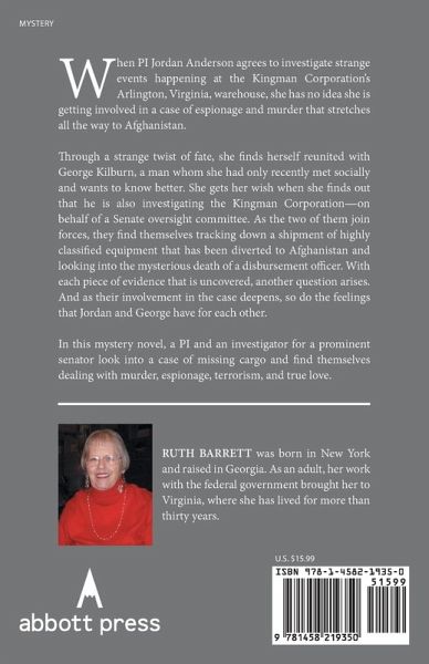 When PI Jordan Anderson agrees to investigate strange events happening at the Kingman Corporation's Arlington, Virginia, warehouse, she has no idea she is getting involved in a case of espionage and murder that stretches all the way to Afghanistan. Through a strange twist of fate, she finds herself reunited with George Kilburn, a man whom she had only recently met socially and wants to know better. She gets her wish when she finds out that he is also investigating the Kingman Corporation-on behalf of a Senate oversight committee. As the two of them join forces, they find themselves tracking down a shipment of highly classified equipment that has been diverted to Afghanistan and looking into the mysterious death of a disbursement officer. With each piece of evidence that is uncovered, another question arises. And as their involvement in the case deepens, so do the feelings that Jordan and George have for each other. In this mystery novel, a PI and an investigator for a prominent senator look into a case of missing cargo and find themselves dealing with murder, espionage, terrorism, and true love.