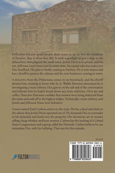 Evil exists because good people don't want to see it. For the residents of Portales, that is what they did. It took a gunfight to put a stop to the debauchery that plagued the small town. Jewels Davis is in prison, and his son, Jefferson, hasn't been seen for some time. An uneasy calm has come over Doc Strafford. His plan is finally coming to fruition. He is now mayor and has a sheriff to protect the citizens and the new businesses coming to town. A detective from the Pinkertons comes in on horseback, and the sheriff detains him, wanting to know who he is. Waldo Emerson announces he is investigating a train robbery. Doc gets in on the tail end of the conversation and informs him he hadn't heard about any train robberies. Over pie and coffee, Detective Emerson confides that women were being abducted from the trains and sold off to the highest bidder. Technically a train robbery, and Jewels and Jefferson Davis were behind it. A man named Emit Carlson arrives on the train. He has a deed and claim to the saloon that Jewels Davis operated out of. He demands Doc to surrender to his demands and hand over the property. His intentions are to resume selling cheap whiskey and loose women. Carlson has the backing of a United States Congressman and a group called the Network. Carlson believes he can intimidate Doc with his bullying. That was his first mistake.
