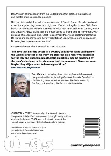 Is the United States disintegrating? Don Watson offers a report from the United States that catches the madness and theatre of an election like no other. This is a historically informed, mordant account of Donald Trump, Kamala Harris and a country approaching democratic high noon. From Los Angeles to New York, from Detroit to Kalamazoo, Watson observes America in all its diversity and conflict, reality and unreality. Above all, he sees the threat posed by Trump and his movement, with its blend of menace and glee, Great Replacement theory and electoral malpractice. Do Harris and the Democrats have what it takes? Can America mend its divisions? Do enough of its voters even want to? An essential essay about a crucial moment of choice. "The fact that half the voters in a country that never stops calling itself the world's greatest democracy are cheering on a man with contempt for the law and unashamed autocratic ambitions may be explained by the man's charisma, or by his supporters' derangement. Take your pick. Maybe they all just want to have a good time." Don Watson, High Noon This essay contains correspondence relating to Quarterly Essay 94 Highway to Hell from Lesley Hughes, Clive Hamilton, David Pocock, Polly Hemming, James Bowen, and Lesley Head