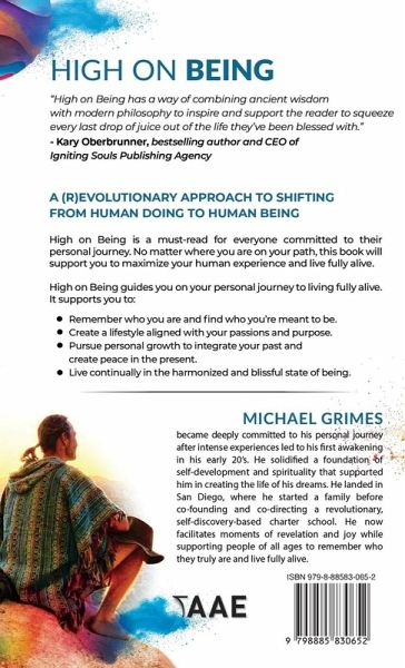 A (R)EVOLUTIONARY APPROACH TO SHIFTING FROM HUMAN DOING TO HUMAN BEING High on Being is a must-read for everyone committed to their personal journey. No matter where you are on your path, this book will support you to maximize your human experience and live fully alive. High on Being guides you on your personal journey to living fully alive. It supports you to:Remember who you are and find who you're meant to be. Create a lifestyle aligned with your passions and purpose. Pursue personal growth to integrate your past and create peace in the present. Live continually in the harmonized and blissful state of being. ¿¿Author, Michael Grimes, became deeply committed to his personal journey after intense experiences led to his first awakening in his early 20's. He solidified a foundation of self-development and spirituality that supported him in creating the life of his dreams. 15 years later, he was living on the beach, with his wife and daughters, serving as CEO of the revolutionary charter school he co-founded. He was on top of the world, living fully alive. Then, his dad was diagnosed with small cell lung cancer, he walked away from the school, and his marriage started to fall apart. His wife moved out on the same day as his dad's funeral. In a year's span, he went from the highest peak he ever stood to the deepest valley he'd ever fallen. He leaned even further into his self work and spiritual practices and tried every healing modality he could find. Slowly he rebuilt. While doing so, he wrote. He captured the healing process and partnered it with sides of ancient wisdom, spiritual philosophies, and modern science to create a trail guide from the valley back to the summit.