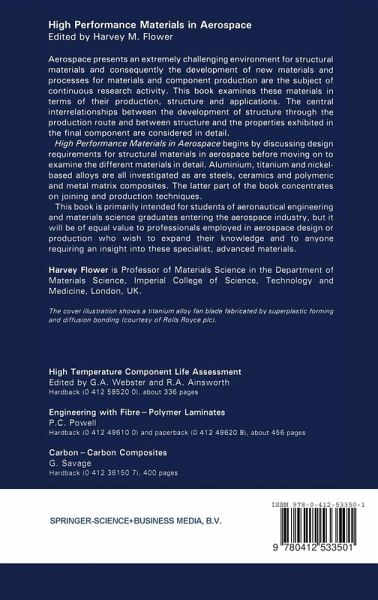 1 Design requirements for aerospace structural materials.- 1.1 Introduction.- 1.2 Properties that affect structural efficiency ab initio.- 1.3 Properties affecting cost of ownership.- 1.4 Cost-effective design.- 1.5 Concluding remarks.- References.- 2 Aluminium alloys: physical metallurgy, processing andproperties.- 2.1 Introduction.- 2.2 Aluminium alloys: processing and properties.- 2.3 Conventional aerospace aluminium alloys.- 2.4 Advanced aerospace aluminium alloys.- 2.5 Conclusions.- References.- Further reading.- 3 Titanium alloys: production, behaviour and application.- 3.1 Introduction.- 3.2 Brief summary of the metallurgy of conventional Ti alloys.- 3.3 The production of Ti alloys and Ti alloy components.- 3.4 The mechanical behaviour and properties of commonTi alloys.- 3.5 Ti-based intermetallic compounds.- 3.6 Summary.- Acknowledgements.- References.- Further reading.- 4 Nickel-based alloys: recent developments for the aero-gasturbine.- 4.1 Background.- 4.2 Alloy constitution and development trends.- 4.3 Processing developments.- 4.4 Microstructure and high temperature deformation.- 4.5 Turbine disk applications.- 4.6 Future prospects.- References.- 5 Structural steels.- 5.1 Introduction.- 5.2 Gear steels.- 5.3 Bearing steels.- 5.4 Ultra high strength steels.- Acknowledgements.- References.- 6 Ceramic materials in aerospace.- 6.1 Introduction.- 6.2 Monolithic and toughened ceramics.- 6.3 Composite ceramics.- 7 Polymeric-based composite materials.- 7.1 Introduction.- 7.2 Reinforcements.- 7.3 Matrices.- 7.4 Interface.- 7.5 Processing.- 7.6 Properties.- 7.7 Joining composites.- 7.8 Non-destructive testing (NDT).- 7.9 Advantages of composite materials.- 8 Metal-based composite materials.- 8.1 Introduction.- 8.2 Metal-ceramic composites.- 8.3 Laminates.- 8.4 Cost.- 8.5 Applications.- 8.6 Appendix.- References.- 9 Superplastic forming.- 9.1 Introduction.- 9.2 Superplasticity and its characteristics.- 9.3 Aerospace superplastic alloys.- 9.4 Post-superplastic straining mechanical properties.- 9.5 Superplastic forming (SPF).- 9.6 Advantages of SPF in aerospace structural design/manufacture.- 9.7 Aerospace applications of SPF.- 9.8 SPF/DB.- 9.9 Advantages of SPF/DB in aerospace structural design/manufacture.- 9.10 Aerospace applications of SPF/DB.- 9.11 Background to the application of SPF and SPF/DB in aerospace.- References.- 10 Joining advanced materials by diffusion bonding.- 10.1 Introduction.- 10.2 Diffusion bonding mechanisms.- 10.3 Effect of surface roughness and contamination on bondinterface defects.- 10.4 Testing of diffusion bonded joints.- 10.5 Diffusion bonding techniques of metals.- 10.6 Diffusion bonding of intermetallics.- 10.7 Diffusion bonding of ceramics.- 10.8 Diffusion bonding of composites.- 10.9 Diffusion bonding of dissimilar metallic materials.- 10.10 Diffusion bonding of metastable alloys.- 10.11 Manufacture of components by diffusion bonding techniques.- 10.12 Conclusions.- Acknowledgements.- References.- 11 Adhesive bonding for aerospace applications.- 11.1 Introduction.- 11.2 Bonded wooden aircraft.- 11.3 Principles of bonding.- 11.4 Aerospace adhesive types.- 11.5 Surface treatments.- 11.6 Design of bonded joints.- References.- 12 Rapid solidification and powder technologies for aerospace.- 12.1 Introduction.- 12.2 Production technologies.- 12.3 Effects on microstructure.- 12.4 Benefits of rapid solidification foraerospace applications.- 12.5 Conclusions.- References.- 13 Hot isostatic processing.- 13.1 Introduction.- 13.2 Removal of porosity.- 13.3 Benefits of HIP.- 13.4 Applications of HIP.- 13.5 Powder products.- 13.6 Diffusion bonding.- 13.7 Other applications.