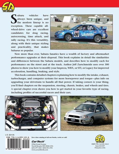 The photos in this edition are black and white. Now more than ever, Subaru fanatics have a wealth of factory and aftermarket performance upgrades at their disposal. In High-Performance Subaru Builder's Guide, author Jeff Zurschmeide explains in detail the similarities and differences between the Subaru models, and describes how to modify each for performance on the street and at the track. He uses over 300 black and white photos to show you how to modify your Impreza, Legacy, WRX, or STI for improved acceleration, handling, braking, and style. The book provides detailed chapters explaining how to modify the intake, exhaust, turbocharger, and computer systems for more horsepower and torque--plus info on upgrading your drivetrain to handle all that power. If taking corners is your thing, you'll find chapters on the suspension, steering, chassis, brakes, and wheels and tires. A special chapter even shows you how to get started in your favorite type of racing, including examples of successful racers and their cars.