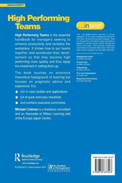 High Performing Teams is the essential handbook for managers seeking to enhance productivity and revitalize the workplace. It shows how to put teams together and accelerate their development so that they become high performing more quickly and thus repay the investment in setting them up. The book touches on the extensive theoretical background of teaming and focuses on pragmatic advice and experience. It is: *rich in case studies and applications *full of quick and easy checklists *and contains executive summaries. Michael Colenso is a freelance consultant and an Associate of Wilson Learning and of the Europe Japan Centre. The ...in brief books provide a critical 'snapshot' of the major management fashions and fads influencing business strategy. They cut through the consultants' jargon and steer a practical, common sense course through the theory and hype. They provide managers with a balanced view based on evidence rather than missionary zeal, so that they can be better informed. Author is a highly experienced author/project manager of training and open learning materials Short, straightforward, comprehensive, pragmatic and broadly sympathetic to the daily plight of the line manager trying to manage change It really is a useful 'How to' book with practical advice on building and developing high performing teams.