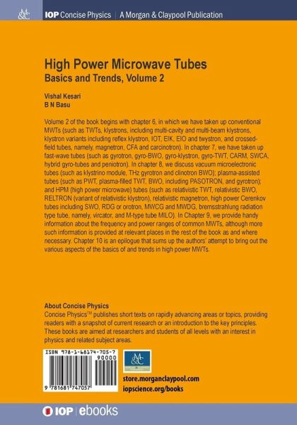 Volume 2 of the book begins with chapter 6, in which we have taken up conventional MWTs (such as TWTs, klystrons, including multi-cavity and multi-beam klystrons, klystron variants including reflex klystron, IOT, EIK, EIO and twystron, and crossed-field tubes, namely, magnetron, CFA and carcinotron). In chapter 7, we have taken up fast-wave tubes (such as gyrotron, gyro-BWO, gyro-klystron, gyro-TWT, CARM, SWCA, hybrid gyro-tubes and peniotron). In chapter 8, we discuss vacuum microelectronic tubes (such as klystrino module, THz gyrotron and clinotron BWO); plasma-assisted tubes (such as PWT, plasma-filled TWT, BWO, including PASOTRON, and gyrotron); and HPM (high power microwave) tubes (such as relativistic TWT, relativistic BWO, RELTRON (variant of relativistic klystron), relativistic magnetron, high power Cerenkov tubes including SWO, RDG or orotron, MWCG and MWDG, bremsstrahlung radiation type tube, namely, vircator, and M-type tube MILO). In Chapter 9, we provide handy information about the frequency and power ranges of common MWTs, although more such information is provided at relevant places in the rest of the book as and where necessary. Chapter 10 is an epilogue that sums up the authors' attempt to bring out the various aspects of the basics of and trends in high power MWTs.