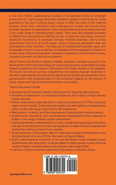 Presenting some of the most recent results of Russian research into shock compression, as well as historical overviews of the Russian research programs into shock compression, this volume will provide Western researchers with many novel ideas and points of view. The chapters in this volume are written by leading Russian specialists various fields of high-pressure physics and form accounts of the main researches on the behavior of matter under shock-wave interaction. The experimental portions contain results of studies of shock compression of metals to high and ultra-high pressure, shock initiation of polymorphic transformations, strength, fracture and fragmentation under shock compression, and detonation of condensed explosives. There are also chapters on theoretical investigations of shock-wave compression and plasma states in regimes of high-pressure and high- temperature. The topics of the book are of interest to scientists and engineers concerned with questions of material behavior under impulsive loading and to the equation of state of matter. Application is to questions of high-speed impact, inner composition of planets, verification of model representations of material behavior under extreme 1oading conditions, syntheses of new materials, development of new technologies for material processing, etc. Russian research differs from much of the Western work in that it has traditionally been wider-ranging and more directed to extremes of response than to precise characterization of specific materials and effects. Western scientists could expect to benefit from the perspective gained from close knowledge of the Russian work.