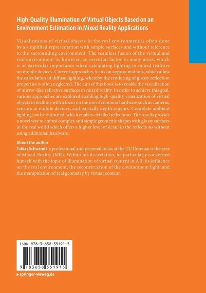Visualizations of virtual objects in the real environment is often done by a simplified representation with simple surfaces and without reference to the surrounding environment. The seamless fusion of the virtual and real environment is, however, an essential factor in many areas, which is of particular importance when calculating lighting in mixed realities on mobile devices. Current approaches focus on approximations, which allow the calculation of diffuse lighting, whereby the rendering of glossy reflection properties is often neglected. The aim of this book is to enable the visualization of mirror-like reflective surfaces in mixed reality. In order to achieve this goal, various approaches are explored enabling high-quality visualization of virtual objects in realtime with a focus on the use of common hardware such as cameras, sensors in mobile devices, and partially depth sensors. Complete ambient lighting can be estimated, which enables detailed reflections. The results providea novel way to embed complex and simple geometric shapes with glossy surfaces in the real world which offers a higher level of detail in the reflections without using additional hardware.