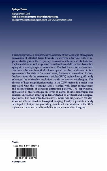 This thesis describes novel approaches and implementation of high-resolution microscopy in the extreme ultraviolet light regime. Using coherent ultrafast laser-generated short wavelength radiation for illuminating samples allows imaging beyond the resolution of visible-light microscopes. Michael Zürch gives a comprehensive overview of the fundamentals and techniques involved, starting from the laser-based frequency conversion scheme and its technical implementation as well as general considerations of diffraction-based imaging at nanoscopic spatial resolution. Experiments on digital in-line holography and coherent diffraction imaging of artificial and biologic specimens are demonstrated and discussed in this book. In the field of biologic imaging, a novel award-winning cell classification scheme and its first experimental application for identifying breast cancer cells are introduced. Finally, this book presents a newly developed technique of generating structured illumination bymeans of so-called optical vortex beams in the extreme ultraviolet regime and proposes its general usability for super-resolution imaging.
