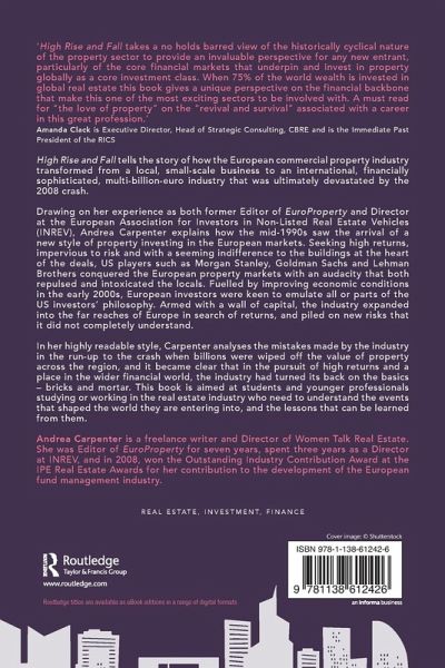 High Rise and Fall tells the story of how the European commercial property industry transformed from a local, small-scale business to an international, financially sophisticated, multi-billion-euro industry that was ultimately devastated by the 2008 crash. Drawing on her experience as both former Editor of EuroProperty and Director at the European Association for Investors in Non-Listed Real Estate Vehicles (INREV), Andrea Carpenter explains how the mid-1990s saw the arrival of a new style of property investing in the European markets. Seeking high returns, impervious to risk and with a seeming indifference to the buildings at the heart of the deals, US players such as Morgan Stanley, Goldman Sachs and Lehman Brothers conquered the European property markets with an audacity that both repulsed and intoxicated the locals. Fuelled by improving economic conditions in the early 2000s, European investors were keen to emulate all or parts of the US investors' philosophy. Armed with a wall of capital, the industry expanded into the far reaches of Europe in search of returns, and piled on new risks that it did not completely understand. In her highly readable style, Carpenter analyses the mistakes made by the industry in the run-up to the crash when billions were wiped off the value of property across the region, and it became clear that in the pursuit of high returns and a place in the wider financial world, the industry had turned its back on the basics - bricks and mortar. This book is aimed at students and younger professionals studying or working in the real estate industry who need to understand the events that shaped the world they are entering into, and the lessons that can be learned from them.