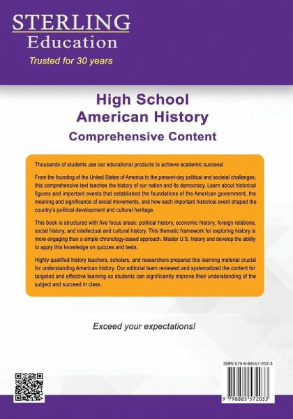 Thousands of students use Sterling to achieve academic success!Comprehensive content book to master high school American history. From the founding of the United States of America to the present-day political and societal challenges, this comprehensive text is a perfect tool for high schoolers to learn about our nation's history and its democracy. Student learn historical figures and important events that established the foundations of the American government, the meaning and significance of the social movements, and how each important historical event shaped the country's political development and cultural heritage. With this book, students master U.S. history content and develop the ability to apply their knowledge on quizzes and tests. It also offers the analysis necessary to make them more engaged and appreciative participants in American society. Many high school students find history to be a boring subject. Keeping track of the dates, names, and events can be daunting and uninteresting. Unlike many American history books, this book is structured around five focus areas: political history, economic history, foreign relations, social history, and intellectual and cultural history. This thematic, context-based framework for exploring history is more engaging than a simple chronology-based approach. Highly qualified history teachers, scholars, and researchers prepared this learning material to build knowledge and skills for understanding American history. Our editorial team reviewed and systematized the content for targeted and effective learning so students can significantly improve their understanding of the subject and succeed in class.