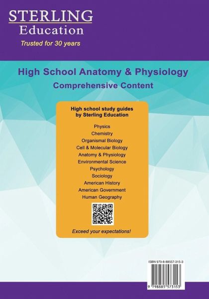 Thousands of students use Sterling to achieve academic success!Comprehensive content book to master high school anatomy and physiology topics. This book provides thorough coverage of high school anatomy and physiology, teaching the foundational theories and concepts necessary to master the core content. The material is clearly presented and systematically organized for learning important principles and relationships, providing comprehensive preparation. From the basic structure of the human body to the complex mechanisms of cellular processes, this comprehensive text is an excellent guide for learning about the human body. This book is an essential overview of body structures and functions, elucidating multidimensional concepts of organ systems. Learn about cell structure, cell cycle, human body planes and directions, endocrine, nervous, respiratory, circulatory, immune, muscular, skeletal, digestive, excretory, and integumentary systems, reproductive anatomy, and fertilization process. Experienced instructors and researchers prepared this learning material to build knowledge and skills crucial for understanding the subject. Our editorial team reviewed and systematized the content for targeted and effective learning, so students can significantly improve their understanding and succeed in class.