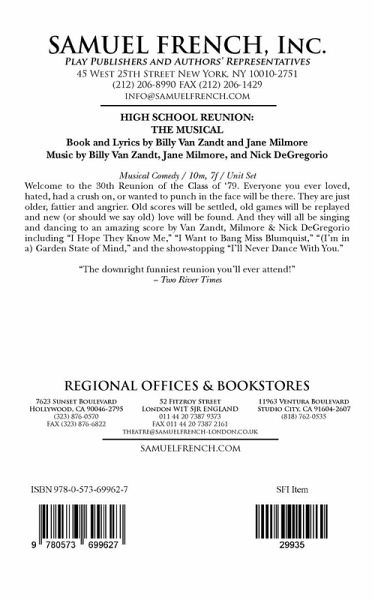 Characters: 10 male, 7 female Unit Set Welcome to the 30th Reunion of the Class of '79. Everyone you ever loved, hated, had a crush on, or wanted to punch in the face will be there. They are just older, fattier and angrier. Old scores will be settled, old games will be replayed and new (or should we say old) love will be found. And they will all be singing and dancing to an amazing score by Van Zandt, Milmore & Nick DeGregorio including "I Hope They Know Me," "I Want to Bang Miss Blumquist," "(I'm in a) Garden State of Mind," and the show stopping "I'll Never Dance With You." "The downright funniest reunion you'll ever attend" - Two River Times