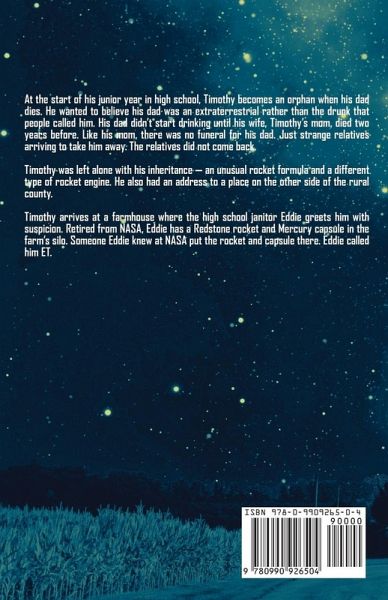 At the start of his junior year in high school, Timothy becomes an orphan when his dad dies. He wanted to believe his dad was an extraterrestrial rather than the drunk that people called him. His dad didn't start drinking until his wife, Timothy's mom, died two years before. Like his mom, there was no funeral for his dad. Just strange relatives arriving to take him away. The relatives did not come back. Timothy was left alone with his inheritance - an unusual rocket formula and a different type of rocket engine. He also had an address to a place on the other side of the rural county. Timothy arrives at a farmhouse where the high school janitor Eddie greets him with suspicion. Retired from NASA, Eddie has a Redstone rocket and Mercury capsule in the farm's silo. Someone Eddie knew at NASA put the rocket and capsule there. Eddie called him ET.