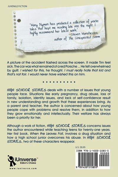 A picture of the accident flashed across the screen. It made Tim feel sick. The car was what remained of a red Porsche ... He felt overwhelmed by guilt. I wished for this, he thought. I must really hate that kid and that's not fair. I would never have wished this on him. HIGH SCHOOL STORIES deals with a number of issues that young people face. Situations like early pregnancy, drug abuse, loss of family, isolation, identity issues, and lack of self-confidence result in new understanding and growth that these experiences bring. As a parent and teacher, the author is concerned about how young people cope with problems and resolve them, in addition to how they grow emotionally and intellectually. Their welfare has always been a priority for her. Although a work of fiction, HIGH SCHOOL STORIES concerns issues the author encountered while teaching teens for twenty-one years. Her first book, When the Leaves Fall, involves a drug situation and how a high school junior overcomes his abuse. In HIGH SCHOOL STORIES, two of these characters reappear. "Mary Nyman has produced a collection of poetic tales that kept me reading late into the night. I highly recommend her latest work." -Steven Manchester, author of The Unexpected Storm