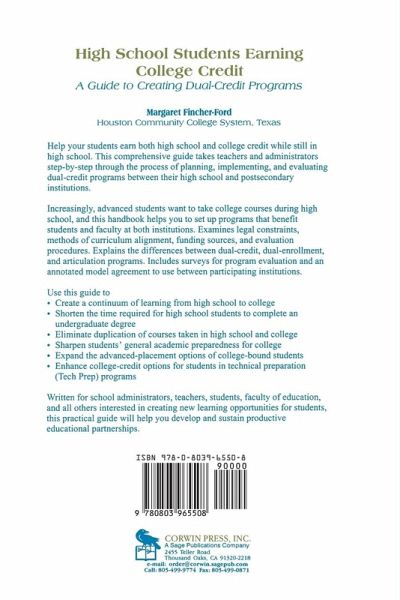 This book details the process of developing agreements between high schools and colleges in the United States to allow students to earn both high school and college credit while at high school. The author explains issues including: legal constraints; processes for curriculum alignment; funding sources; and evaluation procedures.