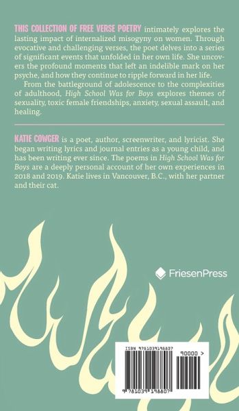 Katie Cowger is a poet, author, screenwriter, and lyricist. She began writing lyrics and journal entries as a young child, and has been writing ever since. The poems in High School Was for Boys are a deeply personal account of her own experiences in 2018 and 2019. Katie lives in Vancouver, B.C., with her partner and their cat.