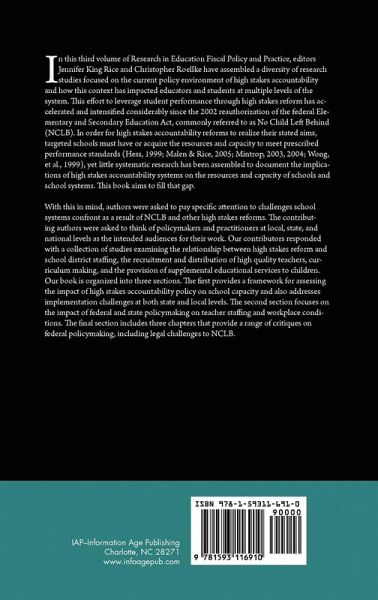 A volume in Research in Education Fiscal Policy and Practice Edited by Jennifer King Rice, University of Maryland and Christopher Roellke, Vassar College In this third volume of Research in Education Fiscal Policy and Practice, editors Jennifer King Rice and Christopher Roellke have assembled a diversity of research studies focused on the current policy environment of high stakes accountability and how this context has impacted educators and students at multiple levels of the system. This effort to leverage student performance through high stakes reform has accelerated and intensified considerably since the 2002 reauthorization of the federal Elementary and Secondary Education Act, commonly referred to as No Child Left Behind (NCLB).In order for high stakes accountability reforms to realize their stated aims, targeted schools must have or acquire the resources and capacity to meet prescribed performance standards (Hess, 1999; Malen & Rice, 2005; Mintrop, 2003, 2004; Wong, et al., 1999), yet little systematic research has been assembled to document the implications of high stakes accountability systems on the resources and capacity of schools and school systems. This book aims to fill that gap. With this in mind, authors were asked to pay specific attention to challenges school systems confront as a result of NCLB and other high stakes reforms. The contributing authors were asked to think of policymakers and practitioners at local, state, and national levels as the intended audiences for their work. Our contributors responded with a collection of studies examining the relationship between high stakes reform and school district staffing, the recruitment and distribution of high quality teachers, curriculum making, and the provision of supplemental educational services to children. Our book is organized into three sections. The first provides a framework for assessing the impact of high stakes accountability policy on school capacity and also addresses implementation challenges at both state and local levels. The second section focuses on the impact of federal and state policymaking on teacher staffing and workplace conditions. The final section includes three chapters that provide a range of critiques on federal policymaking, including legal challenges to NCLB.