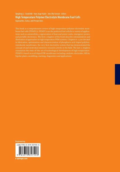 Preface.- Introduction.- Modifications of sulfonic acid-based membranes.- Acid-base chemistry and proton conductivity.- Applications of acid-base blend concepts to intermediate temperature membranes.- Pyridine Containing Aromatic Polyether Membranes.- Techniques for PBI membrane characterization.- Synthesis of Polybenzimidazoles.- Phosphoric acid and its interactions with polybenzimidazole type polymers.- Polybenzimidazole membranes by post acid doping.- PBI membranes via the PPA process.- Polybenzimidazoles with enhanced basicity: a chemical approach for durable membranes.- Polybenzimidazole/porous poly(tetrafluoro ethylene) composite membranes.- PBI-based composite membranes.- Catalysts and Catalyst-Layers in HT-PEFCs.- Catalyst support material and electrode fabrication.- Design and Optimization of HT-PEMFC-MEAs.- Characterization of HT-PEM Membrane-Electrode-Assemblies.- Approaches for the modeling of PBI/H3PO4 based HT-PEM fuel cells.- Bipolar plates and gaskets: Different materials and processing methods.- Stack concepts for high temperature polymer electrolyte membrane fuel cells.- High Temperature PEM Fuel Cell Systems, Control and Diagnostics.- Durability Issues and Status of PBI Based Fuel Cells.- High Temperature Polymer Electrolyte Fuel Cell Systems for Aircraft Applications.- Electrochemical Hydrogen Pumping.
