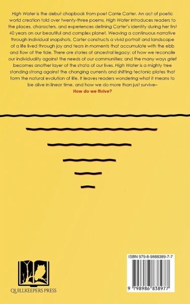High Water is the debut chapbook from poet Carrie Carter. An act of poetic world creation told over twenty-three poems, High Water introduces readers to the places, characters, and experiences defining Carter's identity during her first 40 years on our beautiful and complex planet. Weaving a continuous narrative through individual snapshots, Carter constructs a vivid portrait and landscape of a life lived through joy and tears in moments that accumulate with the ebb and flow of the tide. There are stories of ancestral legacy; of how we reconcile our individuality against the needs of our communities; and the many ways grief becomes another layer of the strata of our lives. High Water is a mighty tree standing strong against the changing currents and shifting tectonic plates that form the natural evolution of life. It leaves readers wondering what it means to be alive in linear time, and how we do more than just survive - how do we thrive?