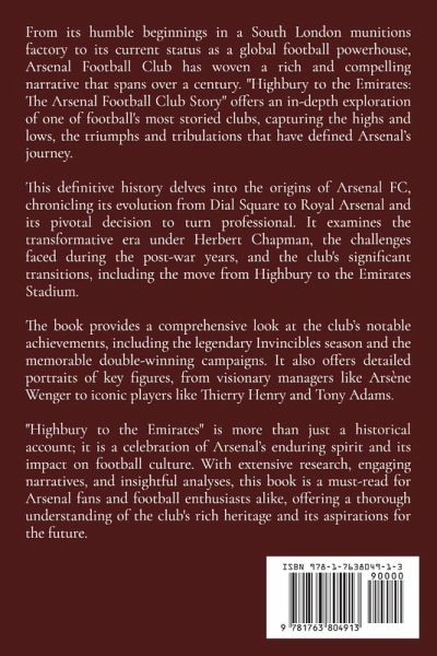 From its humble beginnings in a South London munitions factory to its current status as a global football powerhouse, Arsenal Football Club has woven a rich and compelling narrative that spans over a century. "Highbury to the Emirates: The Arsenal Football Club Story" offers an in-depth exploration of one of football's most storied clubs, capturing the highs and lows, the triumphs and tribulations that have defined Arsenal's journey. This definitive history delves into the origins of Arsenal FC, chronicling its evolution from Dial Square to Royal Arsenal and its pivotal decision to turn professional. It examines the transformative era under Herbert Chapman, the challenges faced during the post-war years, and the club's significant transitions, including the move from Highbury to the Emirates Stadium. The book provides a comprehensive look at the club's notable achievements, including the legendary Invincibles season and the memorable double-winning campaigns. It also offers detailed portraits of key figures, from visionary managers like Arsène Wenger to iconic players like Thierry Henry and Tony Adams. "Highbury to the Emirates" is more than just a historical account; it is a celebration of Arsenal's enduring spirit and its impact on football culture. With extensive research, engaging narratives, and insightful analyses, this book is a must-read for Arsenal fans and football enthusiasts alike, offering a thorough understanding of the club's rich heritage and its aspirations for the future.