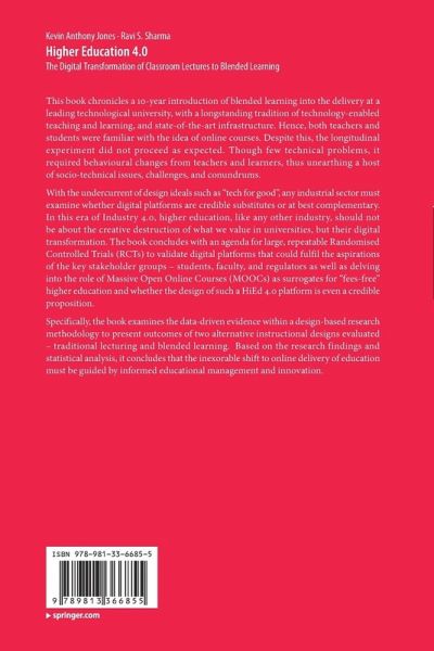 With the undercurrent of design ideals such as "tech for good", any industrial sector must examine whether digital platforms are credible substitutes or at best complementary. In this era of Industry 4.0, higher education, like any other industry, should not be about the creative destruction of what we value in universities, but their digital transformation. The book concludes with an agenda for large, repeatable Randomised Controlled Trials (RCTs) to validate digital platforms that could fulfil the aspirations of the key stakeholder groups - students, faculty, and regulators as well as delving into the role of Massive Open Online Courses (MOOCs) as surrogates for "fees-free" higher education and whether the design of such a HiEd 4.0 platform is even a credible proposition.