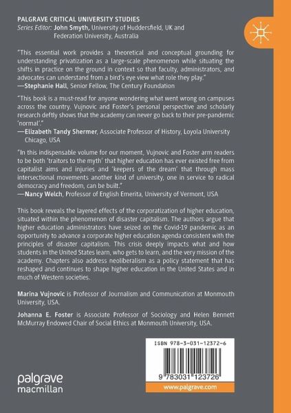 Chapter 1: Introduction: Disaster Capitalism Comes to Higher Education.- Part I: Covid Trojan Horses.- Chapter 2: Laundering Coercion: Restart Planning, "Pandemic Task Forces" and the Dismantling of Shared Governance.- Chapter 3: Flexing for the State: The Push for Hyflex Modalities in State Legislatures.- Chapter 4: Staff Furloughs for Some, Chiefs of Staff for Others (Expand Administration and Shrink the Rest).- Chapter 5: Bringing the F.U.D. to Union Bust.- Part II: Covid Sleights of Hand.- Chapter 6: For the Love of Remote Learning? Now We Love it, Now We Don't.- Chapter 7: Aspiring Diploma Mills Don't Stop for Pandemics.- Chapter 8: Don't Look Now: Tuition Increases and Student Debt.- Part III: Sacrificial Lambs.- Chapter 9: (Further) Stealing from Poor Students: CARES Act Profiteering.- Chapter 10: Student Life and Death: When COVID Responses are Turned Over to Athletics and Student Affairs.- Chapter 11: COVID Testing on Campus: Not Making the Science Grades.- Part V: Anti-Corporatization Resistance.- Chapter 12: Students Demand Justice.- Chapter 13: COVID, Campus Essential Workers, and the Movement for Racial Justice.- Chapter 14: Faculty Fight for the Soul of Higher Education.- Chapter 15: Recommendations and Call to Action.